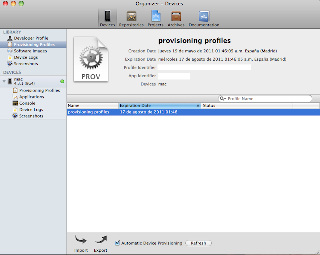 Descargamos el perfil, para instalarlo tan sólo tendremos que arrastrarlo al "Organizer" que se encuentra abriendo el Xcode, vamos al menú  "Windows" y seleccionamos "Organizer".